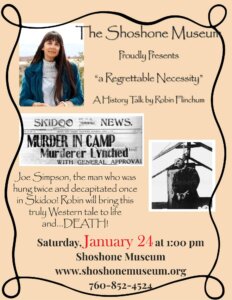 This entertaining talk entitled, “A Regrettable Necessity” is a true western tale of murder and mayhem brought by the killer Joe Simpson. The man who was lynched twice and decapitated once in the western mining camp of Skidoo in Death Valley. Want to know more? Better show up to this entertaining talk! Robin Flinchum is the author of Red Light Women of Death Valley and has a new book coming called “The Redemption of Julia Bulette.” Look for it here at the Museum in April!